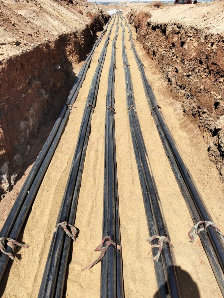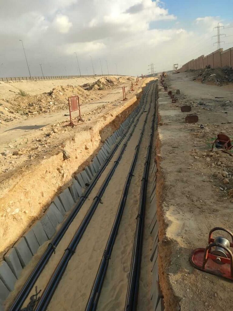 تنفيذ اعمال التركيبات الخاصة بالكابلات الأرضية جهد 66 ك.ف و كذلك كابلات الألياف الضوئية بمشروع ربط محطة محولات القاهرة الجديدة بمحطة محولات الرحاب
